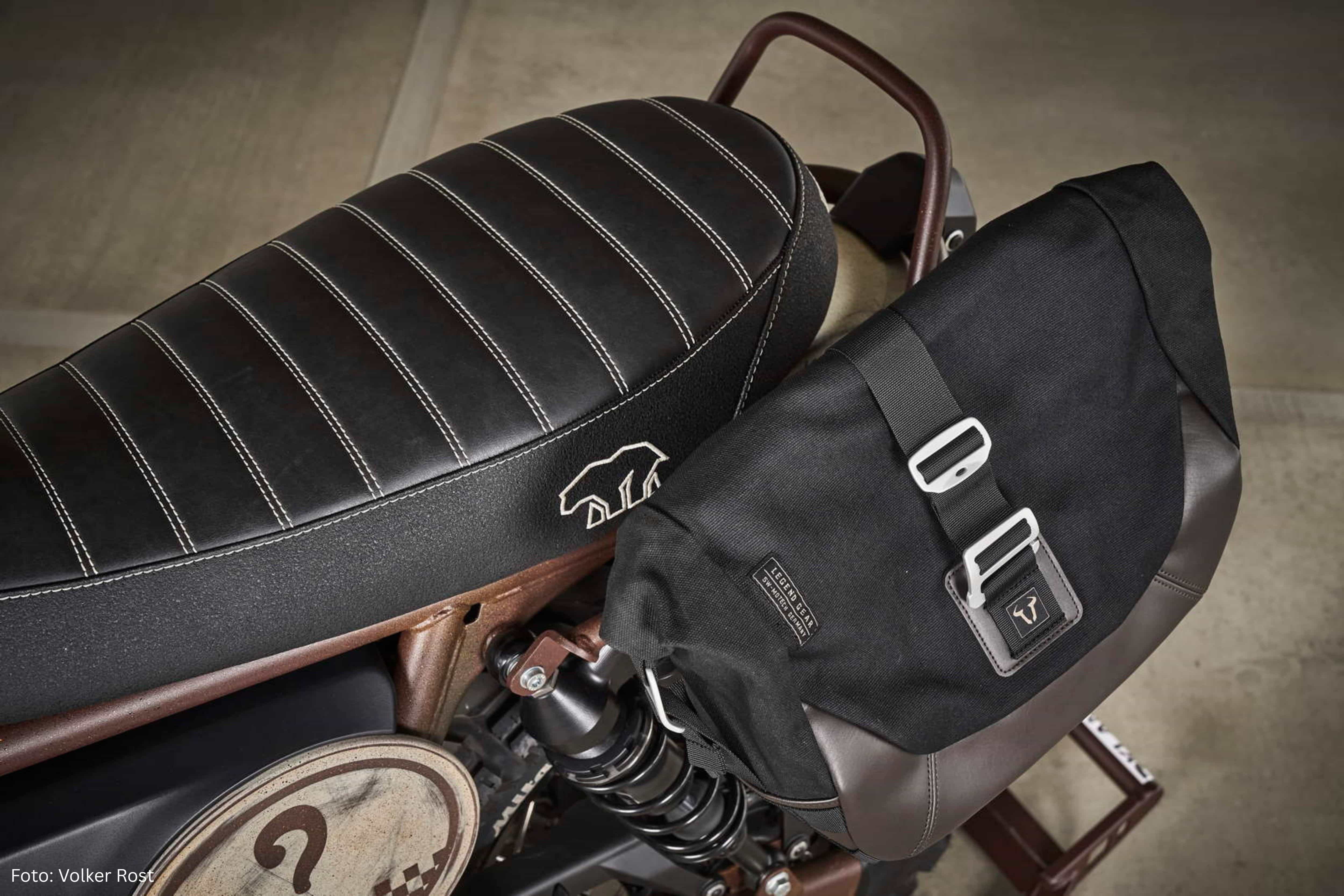 Die BearRunner wurde von den Ausrüsterspeziallisten von SW Motech gut versorgt. Handprotektoren sorgen für mehr Wind und Wetterschutz, eine spezielle Handyhalterung erleichtert die Kommunikation. Hinten wurden seitliche Träger für die Schnellaufnahme der Legendgear Taschen für Tagesausflüge installiert. Und mit der üppig dimensionierten Hecktasche LR4 ist das Bike auch für den mehrtägigen Roadtrip bestens vorbereitet.